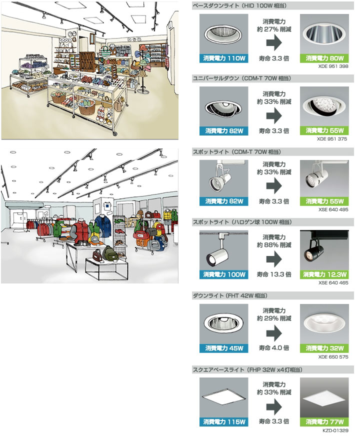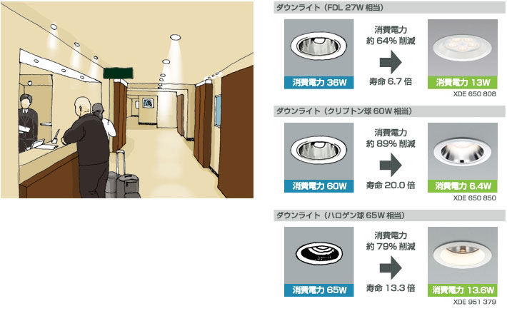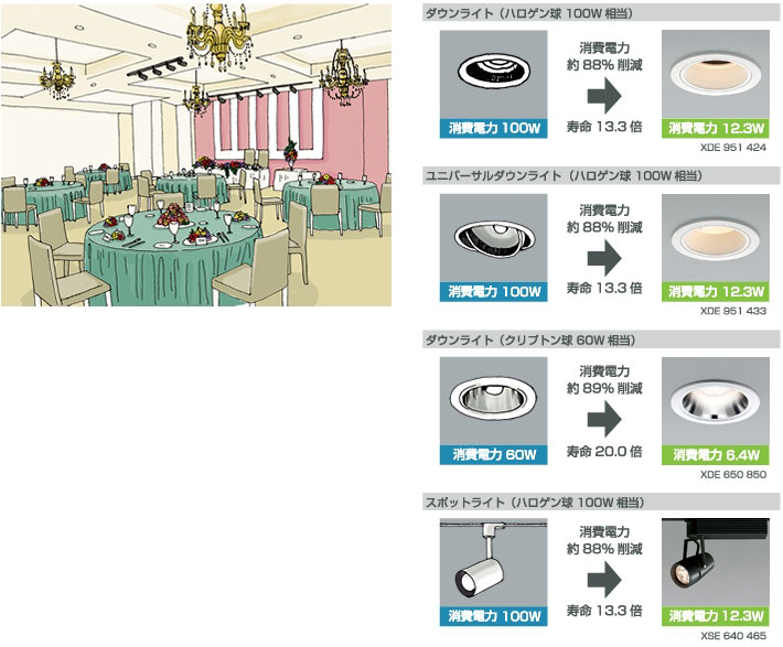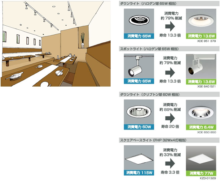 - 高演色、高効率、長寿命のLEDで、従来の白熱電球と比べて大幅に省エネを実現しながらワンランク上の空間を生み出す。