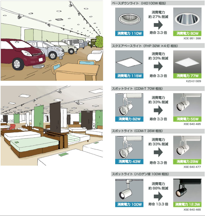 - 調光タイプの高演色LEDであらゆるシーンへ実用性のある光を提供しながら、大幅な省エネも可能に。